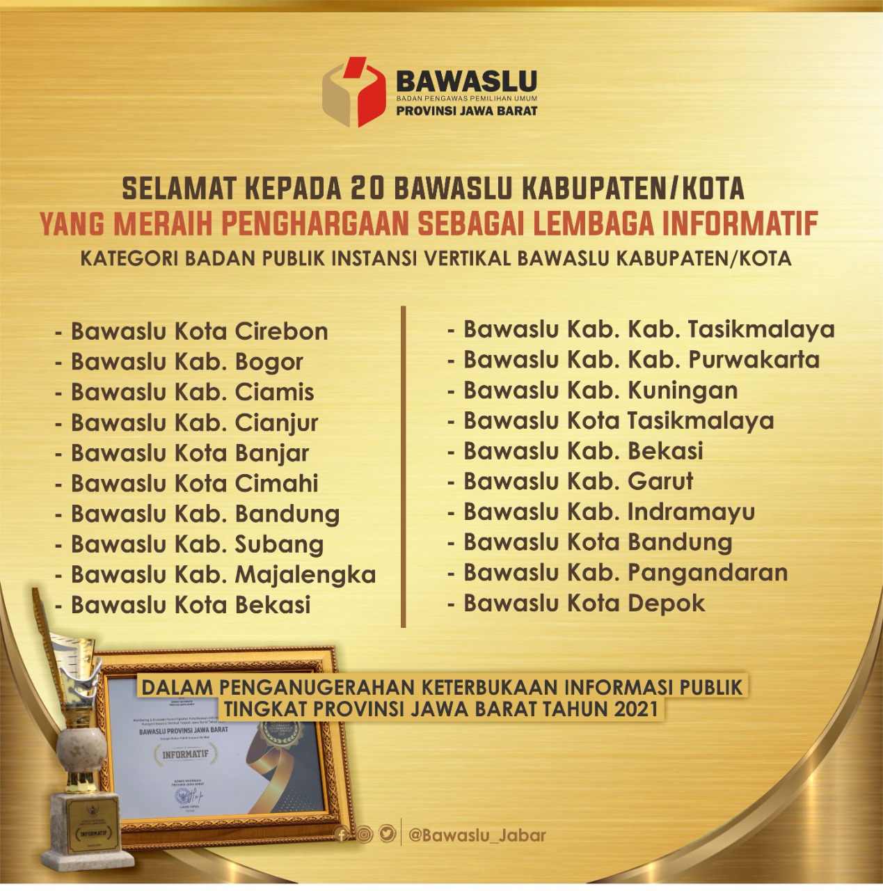 Bawaslu Kota Tasikmalaya meraih predikat sebagai Lembaga Informatif kategori Badan Publik Instansi Vertikal Bawaslu Kabupaten/Kota dari Komisi Informasi Jawa Barat.