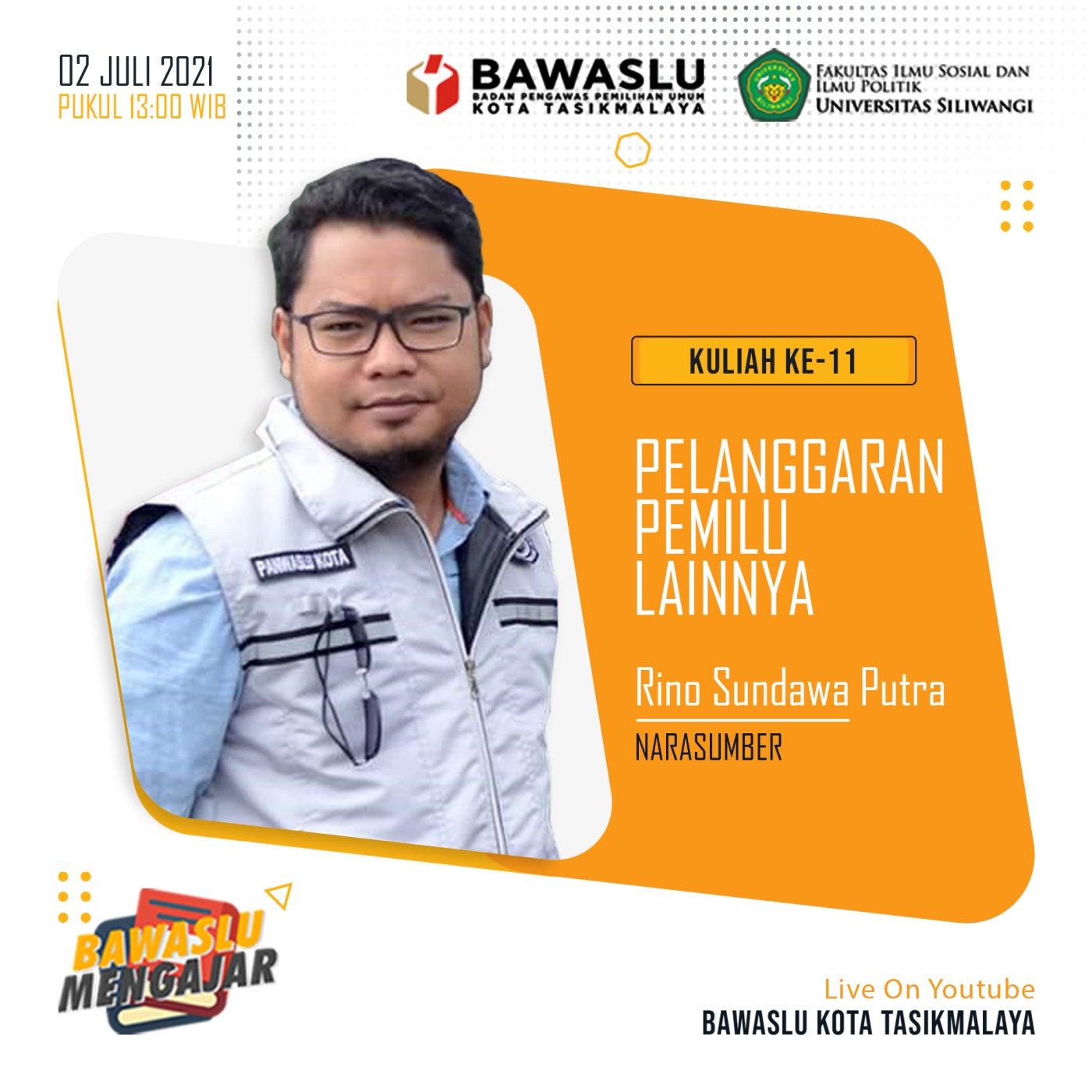 Kali ini program "BAWASLU MENGAJAR" memasuki materi Kuliah ke-11 dengan tema “PELANGGARAN PEMILU LAINNYA" yang akan dipaparkan oleh Rino Sundawa Putra (Anggota Bawaslu Kota Tasikmalaya) sebagai narasumber dan dipandu oleh Selamet Nugraha sebagai moderator.