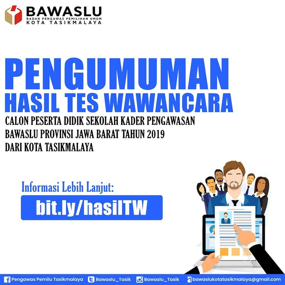 Setelah melakukan penilaian terhadap hasil tes wawancara, bersama ini kami umumkan Peserta Didik Sekolah Kader Pengawasan Partisipatif Bawaslu Provinsi Jawa Barat Tahun 2019 Terpilih dari Kota Tasikmalaya.