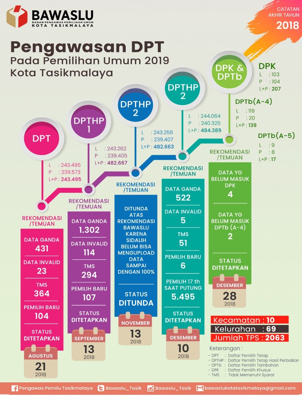 Pada tahapan pengawasan Pemutakhiran Data Pemilih Bawaslu Kota Tasikmalaya memastikan bahwa semua warga negara indonesia yang tingga di Kota Tasikmalaya yang sudah terpenuhi hak pilihnya harus masuk dalam DPT Pemilu 2019, hal ini tentu untuk menjaga hak pilih masyarakat Kota Tasikmalaya. Dari data pemilih yang diambil dari DPT Pilgub Jabar 2018, Bawaslu Kota Tasikmalaya menemukan 431 data ganda, 23 Invalid, 364 tidak memenuhi syarat, dan 104 ditemukan pemilih baru.