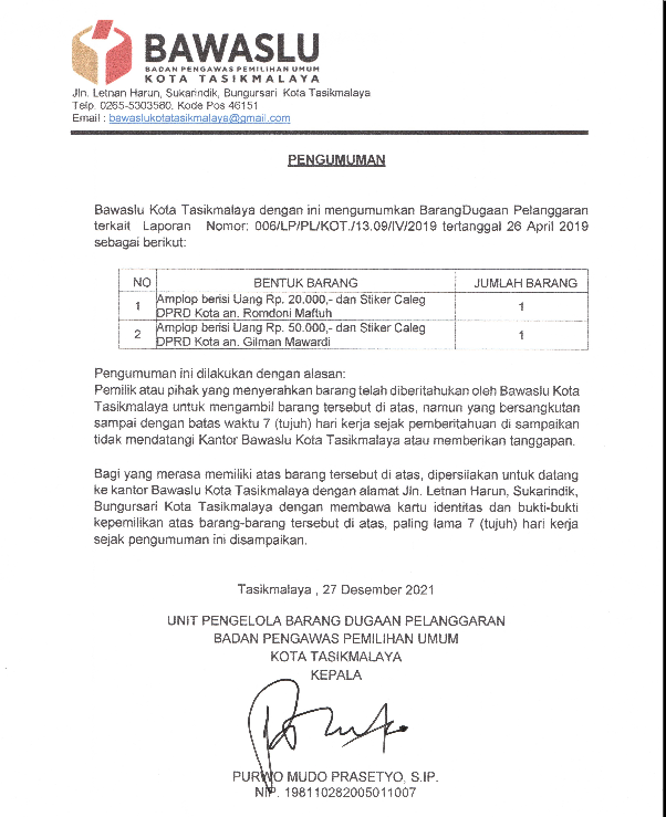 Pengumuman Barang Dugaan Pelanggaran Laporan Nomor: 006/LP/PL/KOT.13.09/IV/2019 Tertanggal 26 April 2019 humas | Senin, Desember 27, 2021 - 12:54 Tag Penanganan Pelanggaran PENGUMUMAN Share Berita Terkini humas Selasa, Januari 13, 2026 - 14:05 Wajah Baru, Semangat Baru: Ketua Bawaslu Kota Tasikmalaya Ajak Jajaran 'Warnai' Kantor dengan Integritas humas Rabu, Desember 17, 2025 - 11:29 Perkuat Integritas Demokrasi, Bawaslu Kota Tasikmalaya dan INUTAS Jalin Sinergi Strategis Melalui Tridharma Perguruan Tinggi humas Jumat, Desember 12, 2025 - 13:21 Bawaslu Kota Tasikmalaya Kawal Transparansi Pemutakhiran Data Parpol, Pastikan Landasan Demokrasi yang Kuat Lihat Lainnya