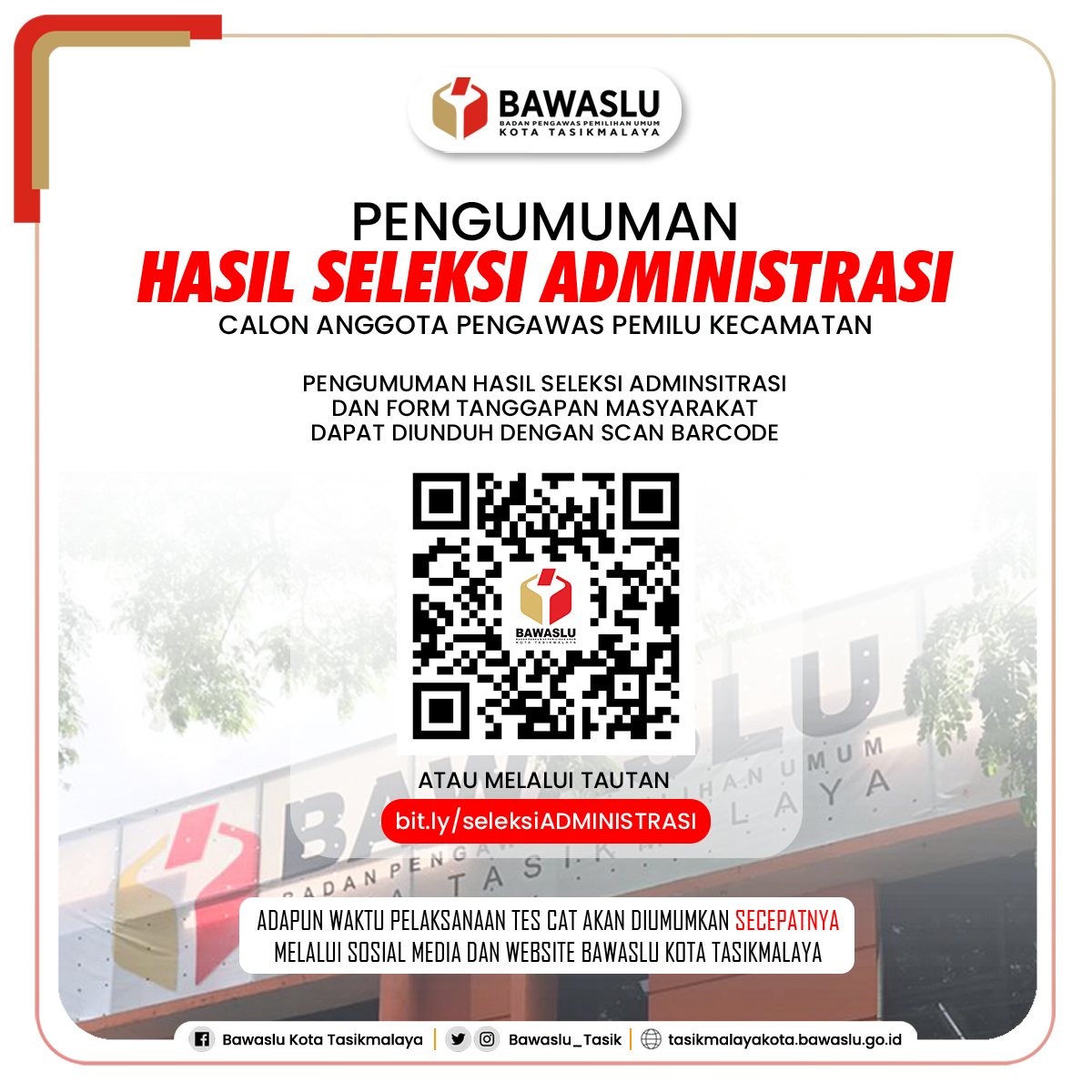 Adapun waktu pelaksanaan tes CAT akan diumumkan secepatnya melalui sosial media dan website Bawaslu Kota Tasikmalaya.