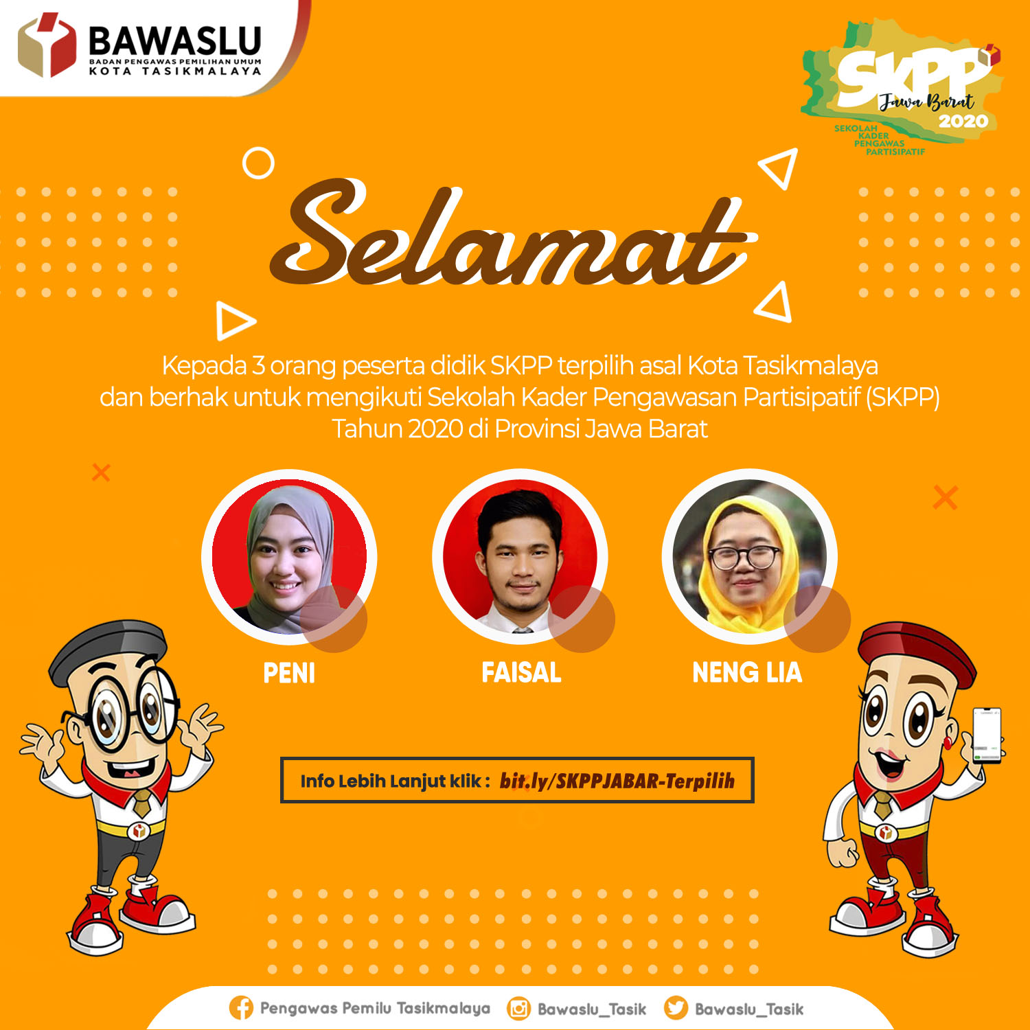 Selamat kepada tiga (3) orang pendaftar terpilih Sekolah Kader Pengawas Partisipatif (SKPP) Jabar Tahun 2020 dari Kota Tasikmalaya. Kami ucapkan terimakasih atas partisipasinya bagi yang telah mendaftar dalam Rekrutmen Calon Peserta SKPP Tahun 2020 di Provinsi Jawa Barat.Informasi lengkap dapat diunduh melalui tautan dibawah ini: